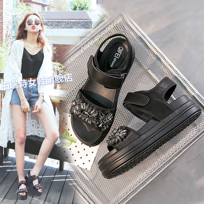 柏瑞詩2017夏季新款女涼鞋韓版真皮魔術貼松糕鞋厚底水鑽羅馬鞋女